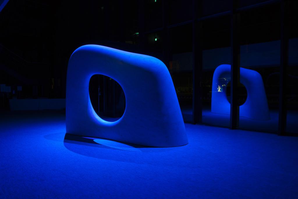 Habituellement, la sculpture est éclairée en blanc, pour souligner la belle matière pierre qui caractérise le travail de Yasuda. Au coucher du soleil, l'éclairage architectural intérieur s'atténue, afin de faire ressortir davantage l'œuvre d'art.